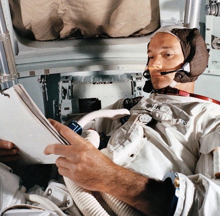 Unfortunately for Collins, the two-and-a-half second round trip time for a radio signal meant that a reply was coming in from Houston at the same time: “Roger. That was a beautiful job, you guys.”