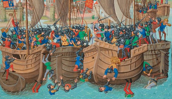 The English fleet of only 150 ships meets a much larger French fleet at the Flanders port of Sluys. The English outmanoeuvre the French ships, capturing most of them and inflicting many casualties, ensuring English naval superiority.