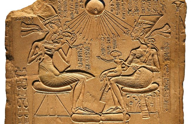 A stele from Amarna showing King Akhenaten (left) and Queen Nefertiti (right) with three of their daughters beneath the Aten’s rays. The future Queen Ankhesenamun is on Nefertiti’s shoulder