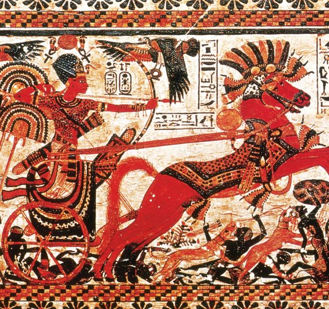 An image of Tutankhamun in his chariot from the decoration around a chest