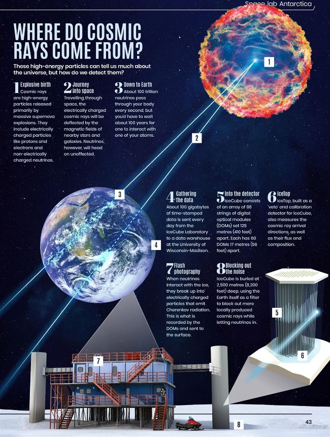 Cosmic rays are high-energy particles released primarily by massive supernova explosions. They include electrically charged particles like protons and electrons and non-electrically charged neutrinos.