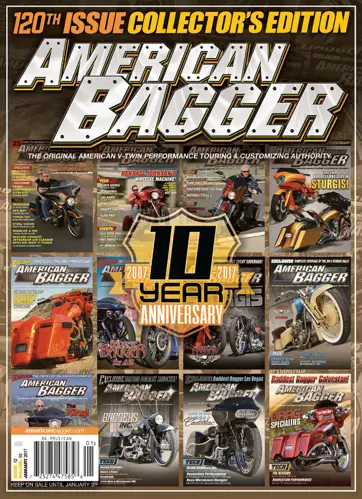 10 Years of American Bagger! Our 120th Collector's Edition 10-Year Anniversary issue features 12 bikes from over the past ten years, including: the Tour De Lux, Dennis Aguirre's 2008 FXR Bagger, Copper Ness, HD GT-1, Sinister, Shot Caller, Black Mamba, Knuckle Dragger, Arlen Ness' 2014 Victory Cross Country, Baggers Inc.'s 1966 FLH, Cadillac, and Drag Bagger. For events we cover the 5th Annual Baddest Bagger Burnouts on the Strip, Baddest Bagger in Vegas and The Ride for Dylan! As always, we bring you the latest in great products with our New Products section and Buyer's Guides: Air Cleaners, Exhaust, & EFI Tuners.