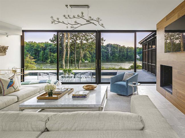 THIS MID-CENTURY HOME IN CHESAPEAKE BAY WAS RENOVATED TO HAVE A SEAMLESS VIEW OF ITS INTERIOR AND EXTERIOR SPACES.