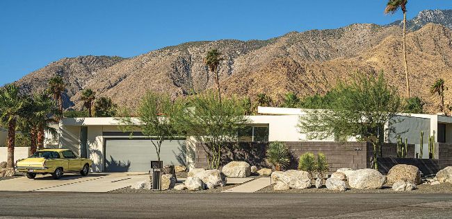 THE 1965 BARRACUDA ADDS SOME CURB APPEAL TO THE HOME. “BRIAN DROVE IT 2000 MILES FROM MISHAWAKA, INDIANA, TO PALM SPRINGS WITHOUT A BLIP!” SAYS HOMEOWNER LISA EBERHART. THE GRAY MASONRY BLOCK