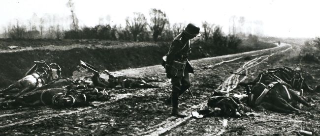 A soldier surveys the bloody aftermath of fighting along a road in the Julian Alps
