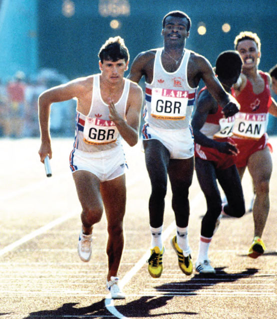 Garry Cook takes the baton from Kriss Akabusi in LA 1984 as they combined with Todd Bennett and Phil Brown to win silver behind the United States