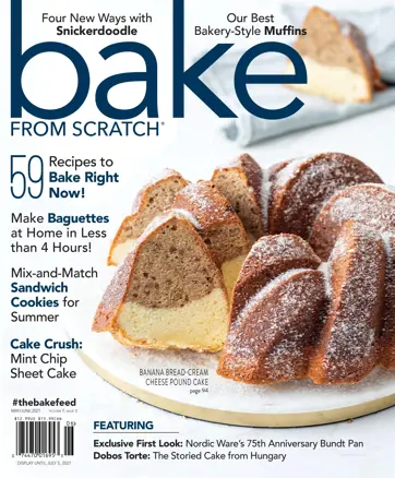 May and June mark the sweet shift from warm spring into hot summer, a time when bakers reap a number of benefits. The longer days promise more time to bake in the blissful daylight, and fresh market offerings such as ripe stone fruit, berries, and herbs open up opportunities for cakes, cookies, and pastries. Our May/June 2021 issue takes every advantage of this golden time. From The Essential . . . Baguette to our crusty breads feature that spans the globe, artisan bread bakers can find a number of recipes to bring bakery-style loaves to the dinner table. Whether you’re looking for to bake with your kid or simply to please the kid in you, our nostalgic Everything Snickerdoodle is the cinnamon-coated extravaganza you’ve been waiting for. If you’ve got more cookie love to spare—and who doesn’t?—try the mix-and-match sandwich cookie collection. From there, bakers can dive into magic muffins, sate coconut cravings, and explore the tender world of oil cakes. Our cover star, the Banana-Cream Cheese Pound Cake is debuting in Nordic Ware’s 75th Anniversary Bundt Pan, a brand-new pan that celebrates Nordic Ware’s history with every detailed ridge and crevice. Finally, our baking and pastry editor takes a deep dive into baking science to answer your most pressing baking queries. So throw on your apron, preheat your oven, and let’s get baking!