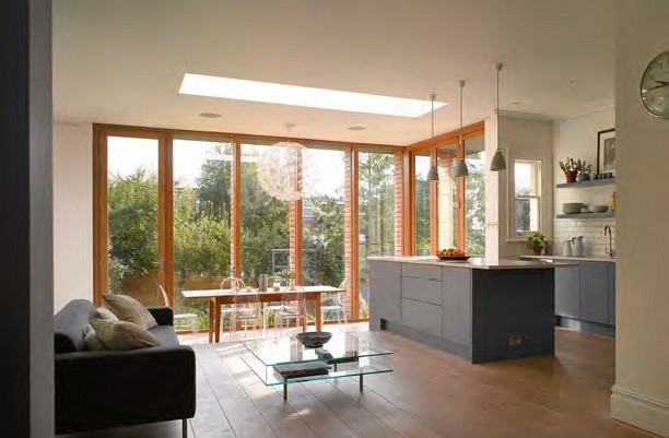 The owners’ brief called for a sunbathed, sustainable addition to the house that would make for a more comfortable space. Divided into two levels, the extension contains a living area and kitchen, with the dining room in the lower level overlooking the exterior.