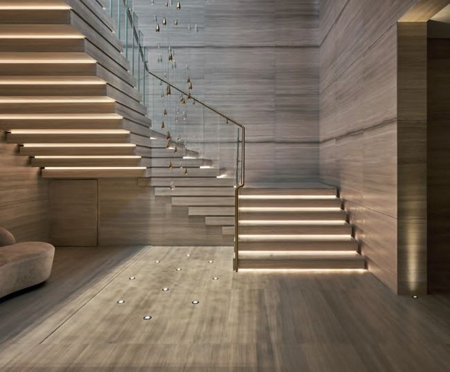 Above left: Illumination under the treads by John Cullen Lighting creates a floating effect and highlights the design of the stairs, while uplighters set in the floor add ambience