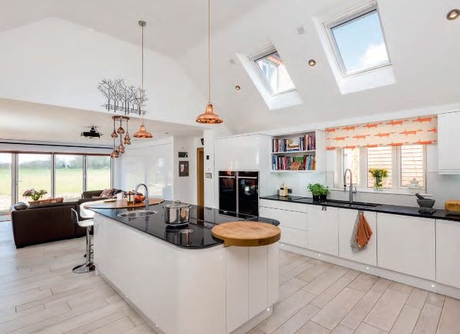 Angled skylight windows introduce extra light into the streamlined contemporary kitchen-diner
