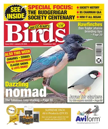 Exactly 100 years ago, eight men held a meeting to launch a Budgerigar Club. The rest is history – the history of what became by royal request the Budgerigar Society. In this special issue, we have a special history of the BS written by the Society historian. We also look to the future, via an in-depth interview with new BS chairman Harry Hockaday. And we return to those earliest days to hear how the Club made its first steps in 1925, as reported in Cage Birds. Happy 100th, BS! On other pages we have a masterclass on breeding hawfinches from Dan Taylor, a portrait of the spectacular rosy starling, and regular roundups on finches, parrots, canaries and winter management.