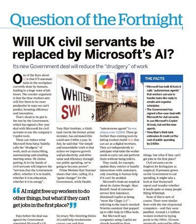I can see how AI will bring long-term benefits to society, but I shudder when I read Microsoft boss Satya Nadella boasting it will end the “drudgery” of work (‘Question of the Fortnight’, Issue 696, pictured). I know he means the boring office tasks nobody wants to do, but drudgery isn’t the way to describe it. That puts a negative spin on work, which is a source of fulfilment in people’s lives.