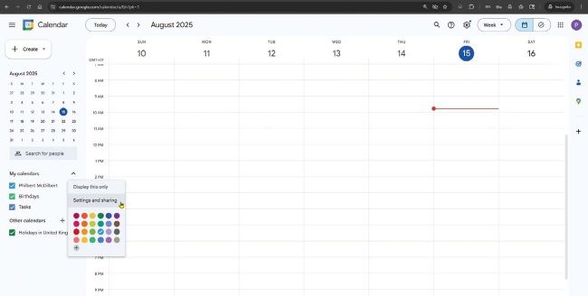 First, log into your Google Calendar at https://calendar.google.com. Then, in the left-hand pane, click to expand the My Calendars section. Ensure the calendar you want to share is ticked, then hover your cursor over its name to reveal the Options menu icon (three dots). Click this, then choose ‘Settings and sharing’ (see screenshot above).