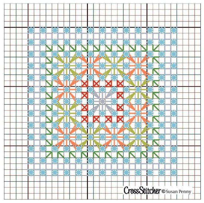Chicken Scratch became popular in the 1930’s to 1950’s in the USA when it was used to decorate aprons. Chicken Scratch is known by different names around the world, including Amish Embroidery, Snowflake Embroidery, Depression Lace, Australian Cross Stitch and Dentelle Vichy in France. The simplicity of Chicken Scratch is what I enjoy most about it. There are just three basic stitches, and originally to make it look like lace, it was stitched in one colour. I like to mix it up a bit and so I have used several colours and even made up a stitch to fill a space. The order of stitching is important, and you must complete all the Double Cross Stitch (Smyrna Cross Stitch) before adding the decorative stitches. These double cross stitches should be worked on every other square of fabric –I chose the dark green square to work these on my design.