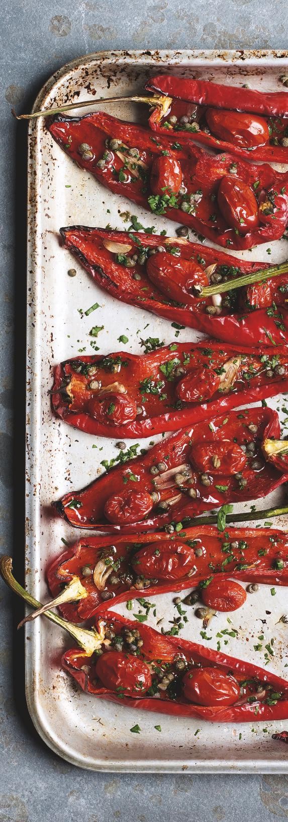“Romano peppers are the long, thin, dark red peppers usually sold in twos or threes in supermarkets. They’re sweeter and more luxuriously flavoured than bell peppers and need no more encouragement than a drizzle of olive oil and a ferociously hot oven to turn them into a satisfactory bit on the side. Here they’re embellished with cherry tomatoes, garlic and fresh thyme, before being sharpened with a dash of vinegar and a few capers. They are great as a foil to rich, hearty meat dishes, whether that’s a roast joint of beef or spicy lamb stew. They’ll also liven up more subtle things such as herb-crusted fish fillets, grilled halloumi or baked mushrooms.”