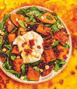 Brown butter pumpkin salad with pomegranate and burrata p76