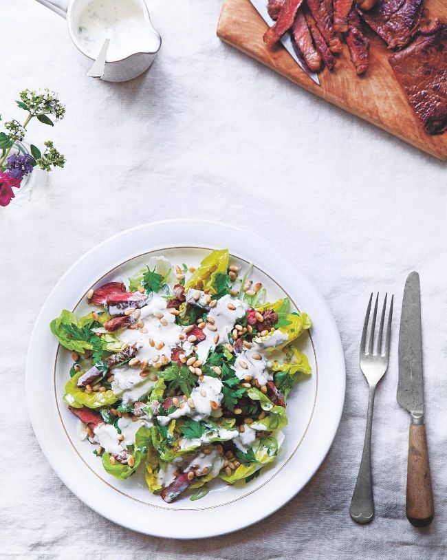 ”Serving it quick-seared, pink and juicy, cut into ribbons, can extend the quantity of the steak you buy. One steak can feed two, two steaks can feed four and so on. Buttermilk (or ranch) dressing is knockout with a steak. The buttermilk lends a sour creamy tang, with the mustard and herbs ramping up the flavour. Natural yogurt would be a good substitute.”