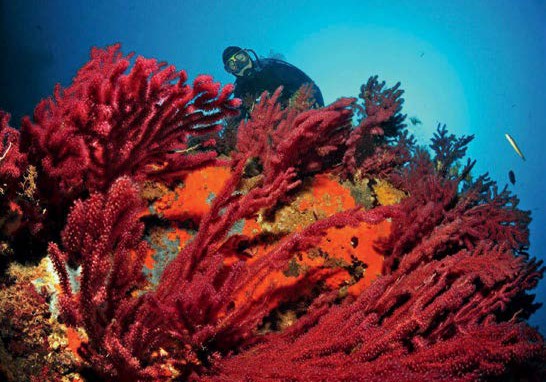 The pinnacle rises from a depth of 48m to within 12m of the surface, and its walls are covered with red coral and gorgonians.
