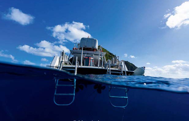 You descend on the mooring line to a shallow plateau at 12m, then fin parallel with the coast to reach the pinnacle, circling it in accordance with your personal depth limits.