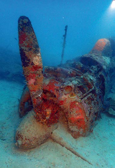 around the wreck and, as you point your torch under the wing, you see the undercarriage exposed and teeming with life.