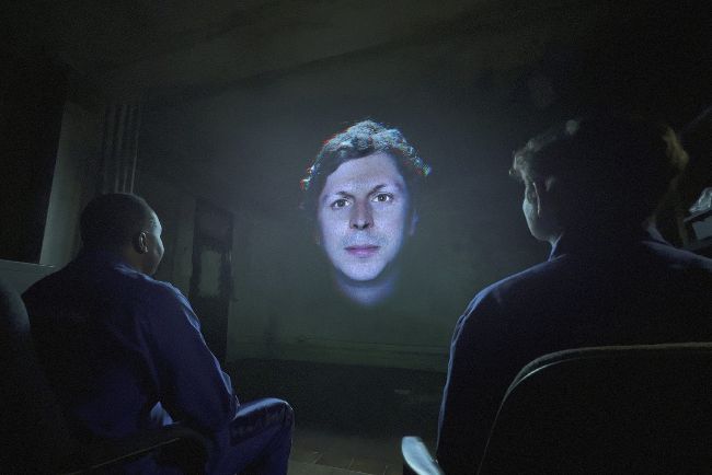 ‘Dead’ tech billionaire Fealty (Michael Cera) addresses his workforce.