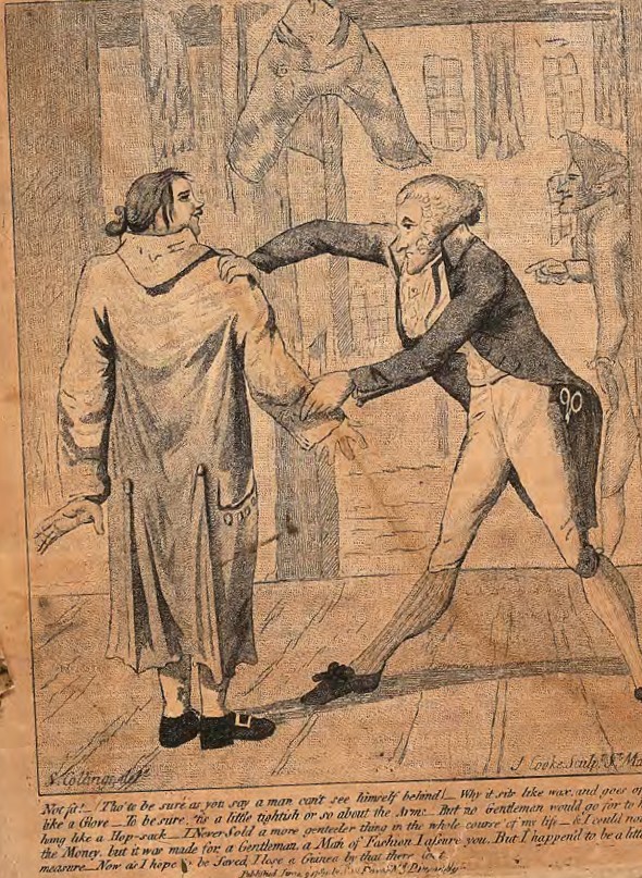 A tailor attempts to make a coat fit his customer when it is much too large (etching by J Cooke after S Collings, 1789)