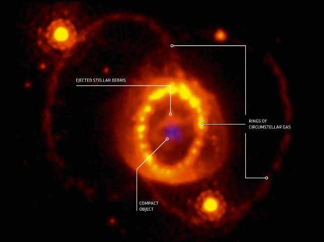 It may look like the Eye of Sauron, but the tiny purple-blue sphere in the image above is actually an incredibly dense neutron star surrounded by stellar debris. The image marks the moment an international team of astronomers found the neutron star hidden inside a giant supernova that exploded 37 years ago.