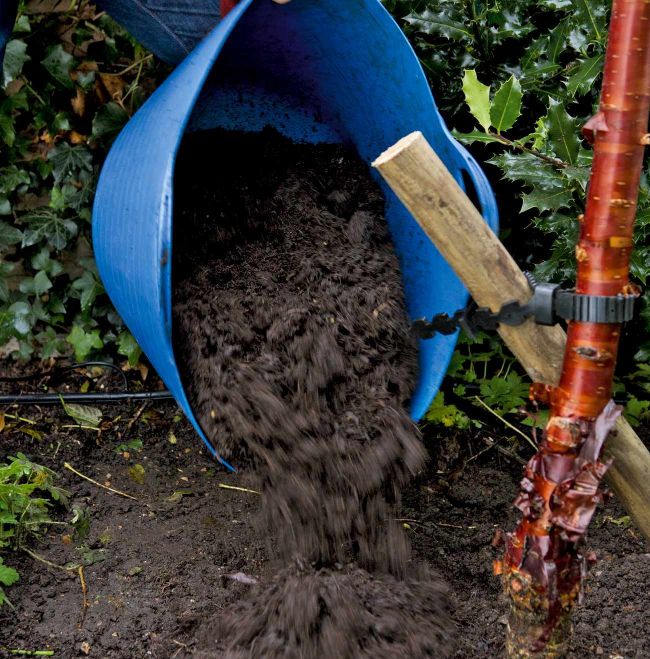 First, weed around the base of the tree and water if the weather has been dry for a while. Next, pour on a 5-10cm thick layer of homemade compost, leafmould or rotted manure.