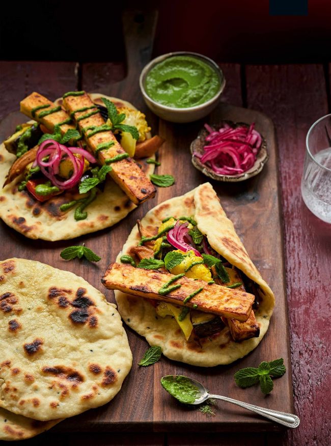 4 Heat the grill to the highest setting. Put the paneer strips on a baking tray and grill for 5-6 mins on each side, until they start to brown. Alternatively, roast in the baking tray when cooking the vegetable traybake (left). Toss with the roasted veg, then serve with the green chutney and naan.