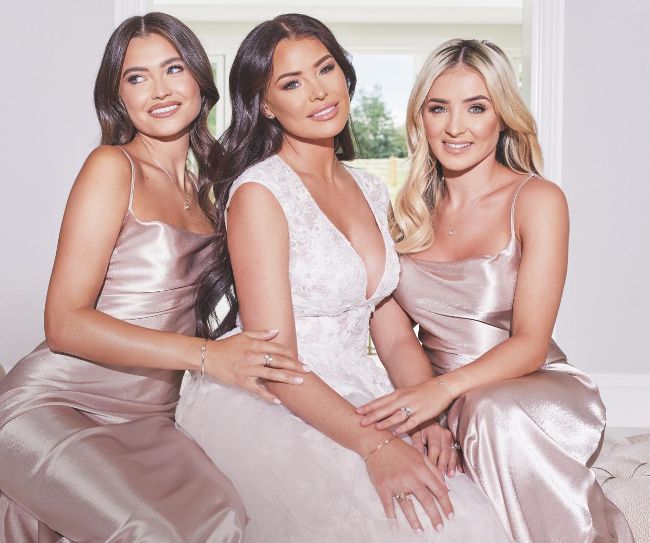 Jess with two of her bridesmaids, sister Natalya (left) and sister-in-law Hollie Kane Wright. Natalya wears: Sterling Silver 0.5ct Pendant & Necklace, £575; 14k White Gold 0.25ct Ring, £525; 14k White Gold 1ct Ring, £1,290; 14k White Gold 0.25ct Open Bangle, £1,090. Jess wears: 14k Gold 0.25ct Open Bangle, £1,090; 14k Gold 0.5ct Ring, £690; 14k Gold 1ct Rings, £1,290 each; 14k White Gold 0.5ct TW Sparkling Teardrop Stud Earrings, £690; 14k Gold 0.25ct Pendant &