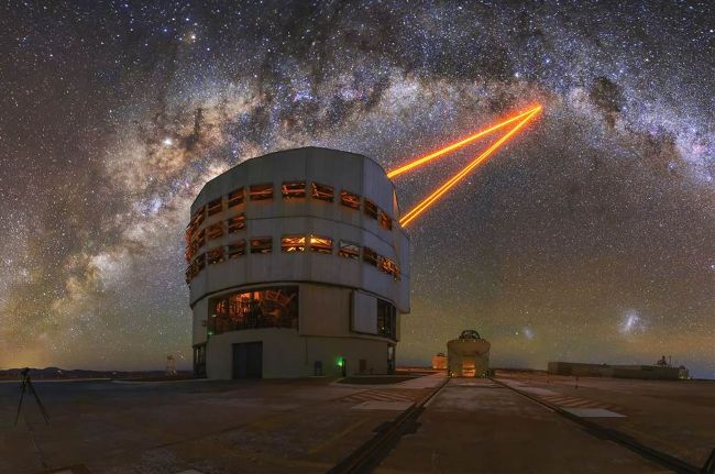 The European Southern Observatory’s Very Large Telescope (VLT), emits powerful lasers to assist astronomers studying stars. To battle against a star’s twinkle, astronomers use adaptive optics, whereby they shoot a laser into the sky to replicate another bright star. They can use the shine from the artificial star to correct for the atmospheric turbulence and monitor their target star in greater clarity.