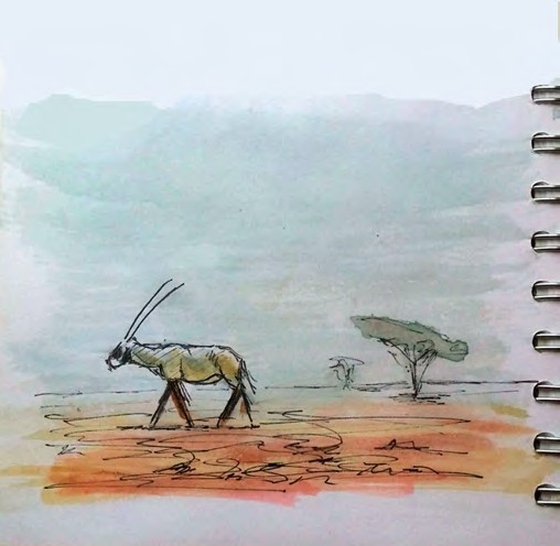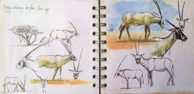 Observe that the coloured oryx on the right-hand page of my field sketchbook actually became one of the more faint animals in the completed painting on page 33. Your reference must inspire, not tie you down.