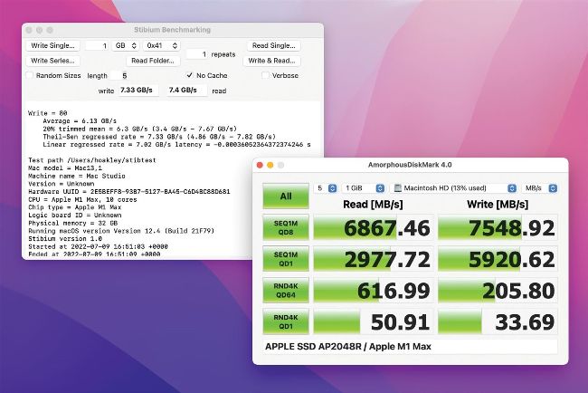 The top pair of figures in AmorphousDiskMark should provide a good assessment of the speed of your disks.