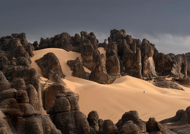 After 13 years of trying, I finally managed to gain access to some of the most remote regions of Algeria’s Ahaggar National Park, following a long period of political instability. Encompassing 173,745sq miles, the park is dominated by vast desert expanses and towering pinnacles sculpted by wind and time. Volcanic activity, tectonic uplift and extreme weathering have also played their part, shaping one of the Sahara’s most stunning and surreal desertscapes. I was joined there by a Tuareg guide, who you can just make out walking across the ridge of dunes.