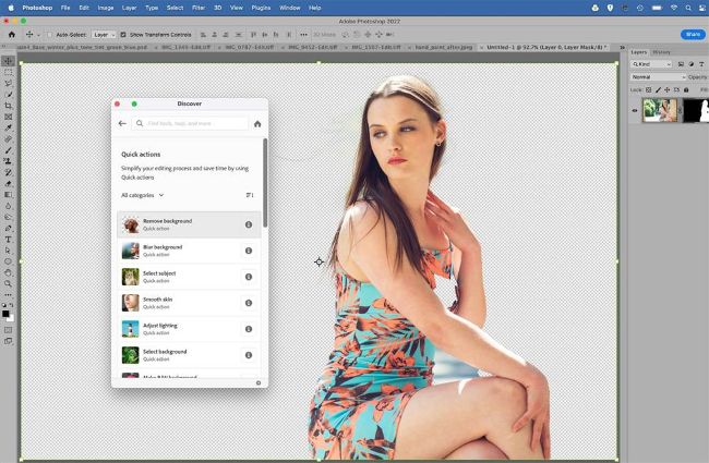 ►► Press Cmd/Ctrl+F to bring up the Discover menu. Click on Quick Actions, then choose Remove Background. Drop in a new background image, and drag it below the other layer.