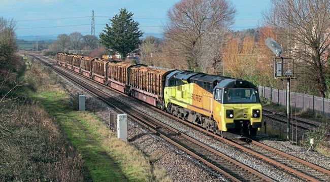 Colas Railfreight Class 70 No. 70803 passes Norton Fitzwarren on January 19 with the Newton Abbot Hackney Yard-Abergavenny Up Sidings loaded trial