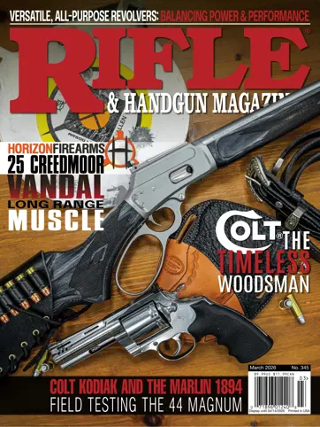 On the Cover: A Marlin 1894 Trapper fitted with both a rear aperture and a front blade sight from Skinner Sights and an Anechoic compact AnechoX 45 suppressor. Alongside the Marlin is a Colt Kodiak with a 41⁄4-inch ported barrel. Both are chambered in 44 Magnum. To carry the Kodiak in the field is a Sourdough Pancake Surf & Turf holster made by Rob Leahy of Simply Rugged Holsters. This issue features One Cartridge, Two Guns, The Colt Woodsman Match Target, Horizon Firearms Vandal Prime in 25 Creedmoor, Smith & Wesson's Brazilian Contract Modelo 1937, Sporting Bolt-Action Rifle Stock Designs, All-Purpose Revolvers, and much more.