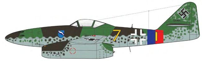 Messerschmitt Me 262A-1a, 7+I, werknummer 500491, owned by the National Air and Space Museum- port side view. Finish is in RLM 81 281H Olive Green (Vallejo 71.020 German Green*) and RLM 82 B567 Bright Green (Vallejo 71.007 Olive Green*) to the upper surfaces with the same colours applied as mottled blotches. The undersides are in RLM 76 Light Blue (Vallejo 71.257 Light Blue RLM 76). The finish and markings types/positions have been matched to photographs. Note that the aircraft splinter scheme demarcations are an approximate match to the standard scheme as laid down in official documentation.