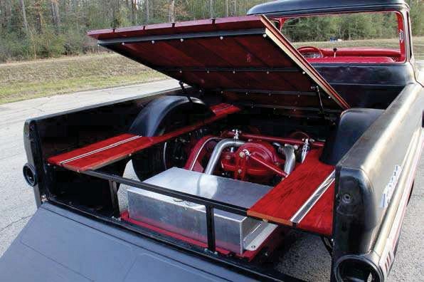 THERE’S A LOT TO SEE WITH CHRIS’ ‘59 AT A QUICK GLANCE, BUT THERE’S A LOT MORE ONCE YOU TAKE A CLOSER LOOK. THE HIDDEN ACCESS DOOR IN THE BED SHOWS OFF THE POWDERCOATED FRAME AND ALUMINUM FUEL CELL, ALL OF WHICH WAS WELDED UP BY POPEYE’S ROD SHOP.