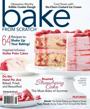 Our July/August issue is one big love letter to summer. We celebrate the seasonal haul of fresh produce by revealing our top secret for extracting the best flavor from fruit: roasting. Our roundup of roasted fruit recipes includes blueberries, mangoes, pineapple, and strawberries—which make way for our perfectly pink cover star, Roasted Strawberry Cake. We also have an entire section devoted to a revamped take on a childhood favorite: poke cakes. From a decadent hummingbird remake to a German chocolate dream, these are the flavor-infused cakes you won’t want to miss. Then we cool things down with our custard powder feature, a gorgeous ode to the vanilla-forward benefits of baking with Bird’s Custard Powder. From road trips to beach trips, we have a feature for a classic treat that sports an edible wrapper. Our The Essential . . . Hand Pies feature takes on the portable pastry from the crust up, tackling the filling, crimping, and, if desired, frying the ultimate summer treat. If you are a fan of the natural sweetness that honey provides, don’t miss our deep-dive into the history and science of honey followed by four honey cakes from around the world. Have a love for cookie dough? We do, too. Our recipe for Edible Chocolate Chip Cookie Dough is the most decadent and quickest fix yet. Finally, we share Chef Rakka’s story and recipe for a Syrian pastry called Ekmak, that recalls a special moment in time. From dreamy dinner rolls to sheet pan recipes that feed a crowd, our July/August 2021 issue has all the recipes you’ll need to perfect your summer baking!