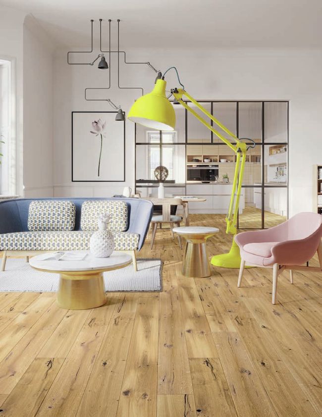 Above: Medio rustic oak flooring is an engineered plank that replicates the look and feel of solid wood.
