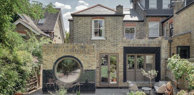 The exterior of this Victorian semi-detached property features glazed brick slip detailing in a contrasting Midnight colourway to create a stunning finish. The innovative design is by Fraher &