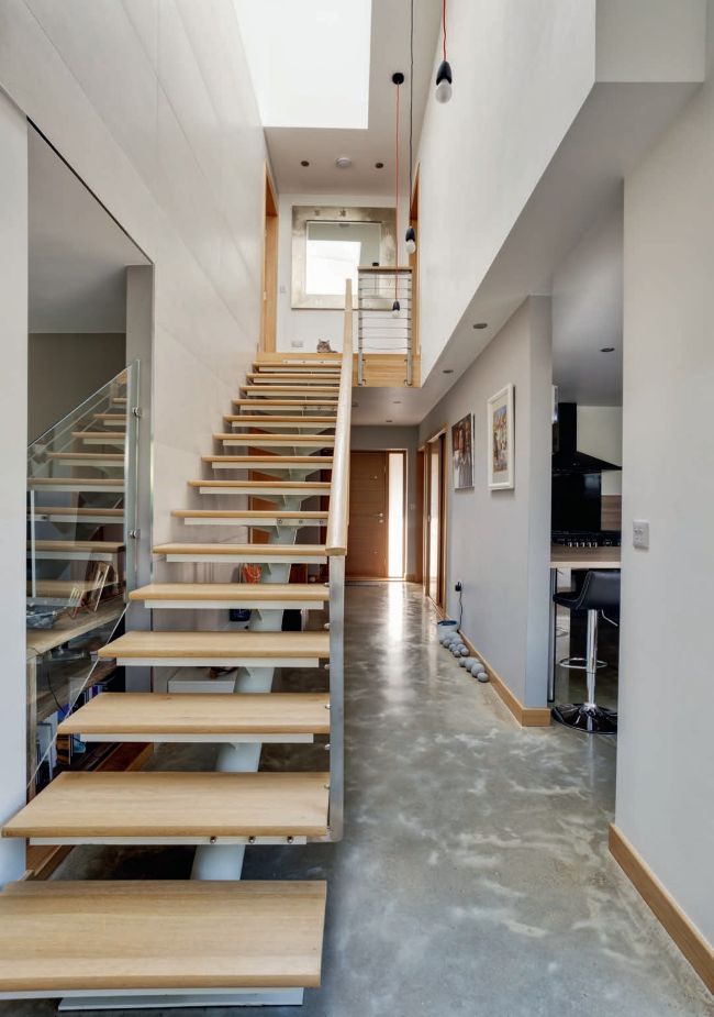 The architect-designed flight was built in Hungary and assembled onsite. It features timber, metal and glass elements, which all work together to produce a striking contemporary staircase
