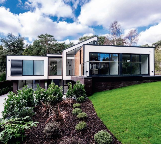 Nestled into the gentle incline of a sloping site, this contemporary dwelling has been oriented so that its occupants can take full advantage of attractive vistas across the garden. Thanks to the building’s bold, angular structure and the array of crisp, modern finishes that have been employed, the overall effect is of a striking sculptural form rising up from the landscape.