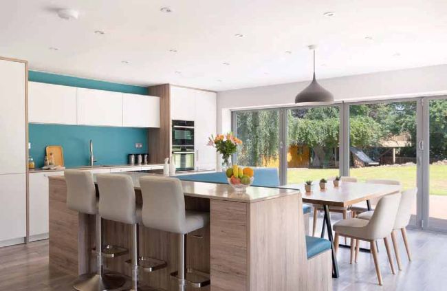 Expansive glazed bifold doors provide gorgeous views of the surrounding area