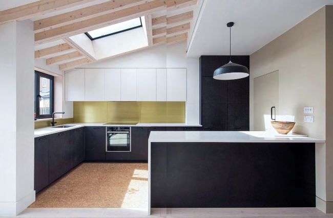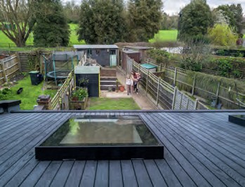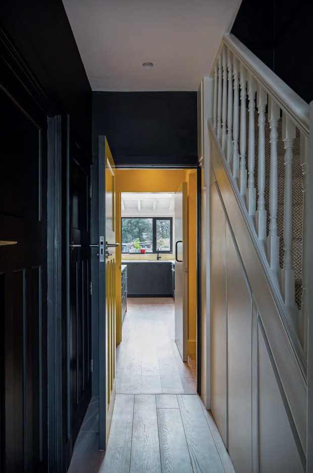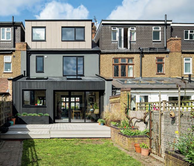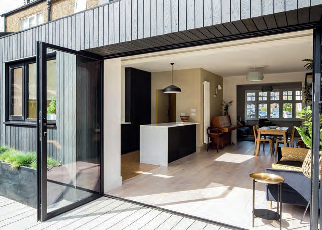 The home’s awkward lean-tos have been replaced by a full-width extension, finished with charred Accoya cladding, two large rooflights and black framed bifold doors that connect the garden with the new living space