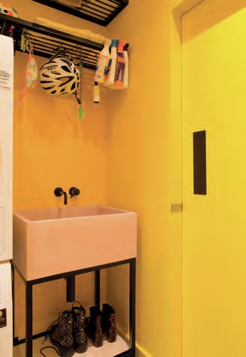 A pop of colour in the heart of the home, the utility room features an allyellow palette, with a concrete butler sink, cork flooring and bespoke metal shelving. The utility room connects to the kitchen via a concealed Selo door, which blends into the wall finish. The utility sink is from Warrington + Rose