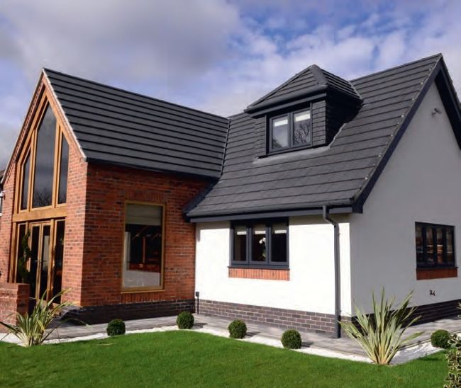 This Nottinghamshire home combines Rehau Total70 PVCu windows in anthracite grey with an oak-framed gable entrance