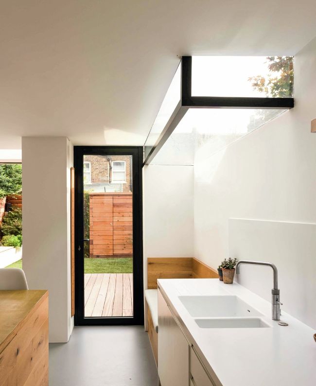 Designed by William Tozer Associates, this sleek box rooflight neatly highlights a discreet seating zone in the openplan extension, while bringing natural brightness into the task zone around the sink