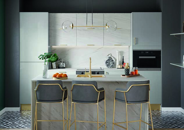 1 Choose a slick culinary zone with glossy grey cabinetry to reflect light. Marble surfaces add elegance, complementing the simple lines of this design. Nova glossy grey, from £2,068, magnet.com